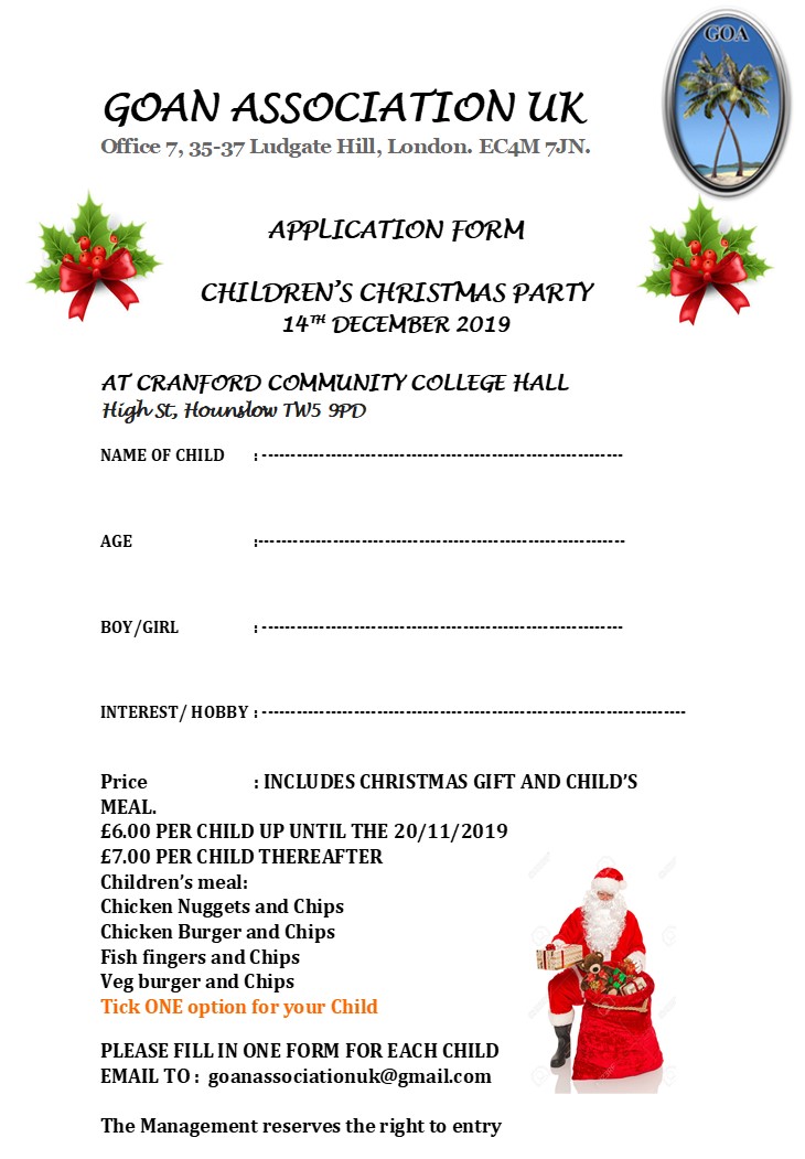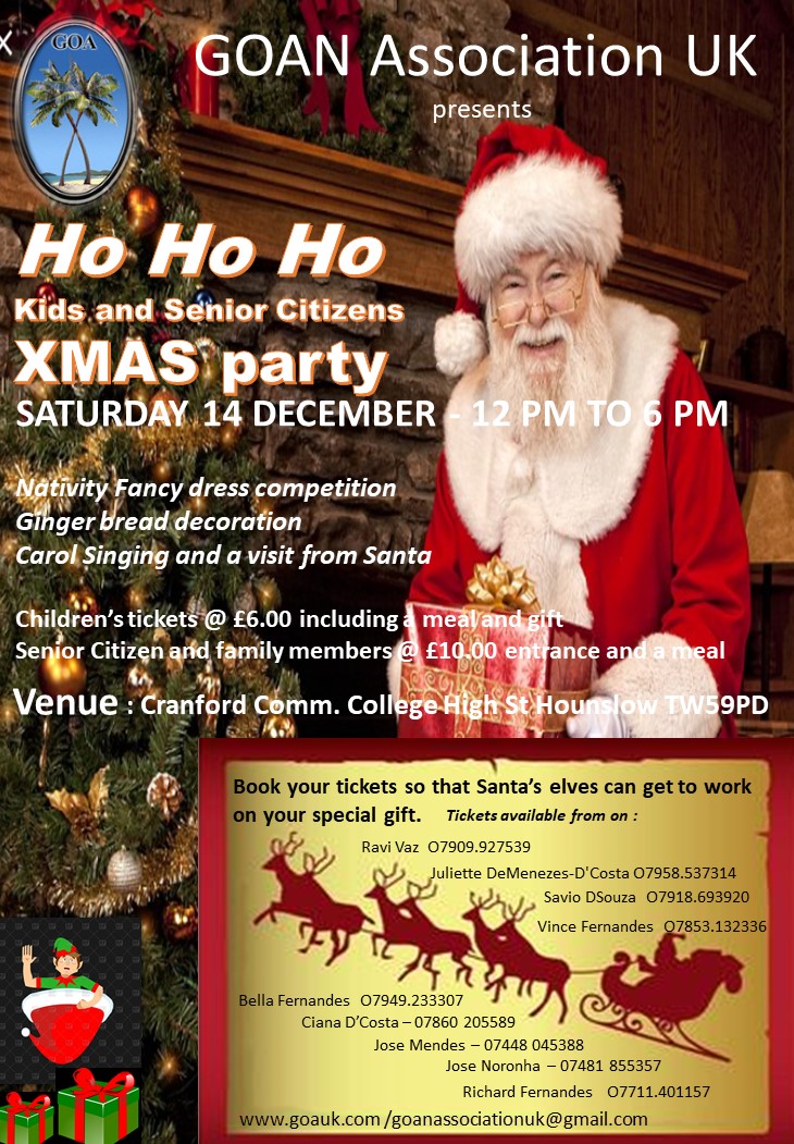 GOA UK – CHILDREN’S CHRISTMAS PARTY/ SENIOR CITIZENS MEAL, Saturday 14th December 2019
