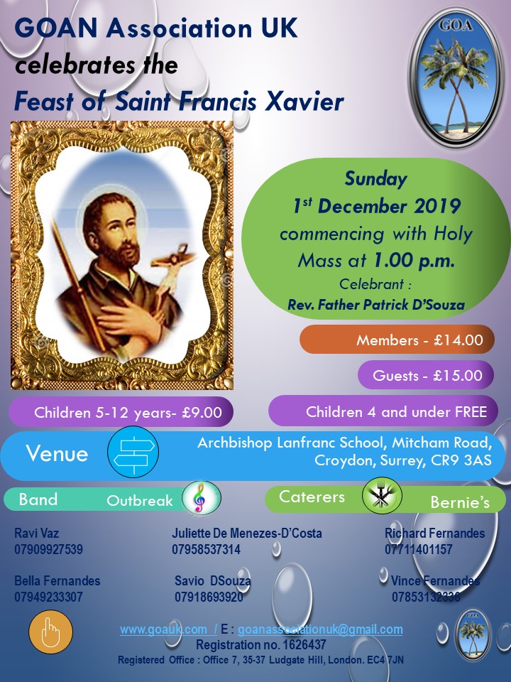 GOA UK – ST FRANCIS XAVIER’S FEAST, 1.00 p.m. Sunday 1st December 2019