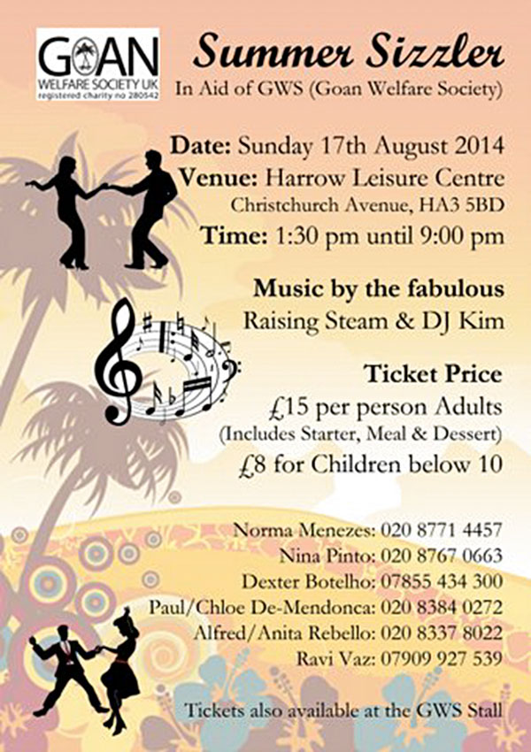 All proceeds to the Goan Welfare Society (Registered Charity No. 280542).